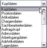 Öffnen Sie nun im oberen Bereich des ReportBuilders das Listenfeld (hier im Beispiel: Kopfdaten) um die Datenquelle auszuwählen.