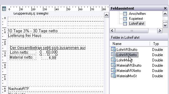 Die Gesamtbetragsfelder: LohnVKBrutto, LohnVKNetto, LohnMwSt, MaterialVKBrutto, MaterialVKNetto, MaterialMwSt. stehen im ReportBuilder im Feldassistent unter LohnFahrt zur Verfügung. Von da aus werden sie in die Belegvorlagen gezogen. Beispiel: