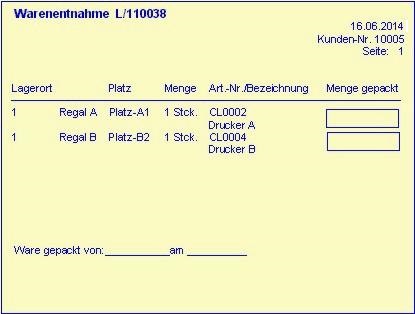 Wenn Sie jetzt auf den Button "LagerBel" im Beleg klicken, wird die Warenentnahme- bzw. Warenzugangsliste ausgedruckt. Beispiel einer Warenentnahmeliste: