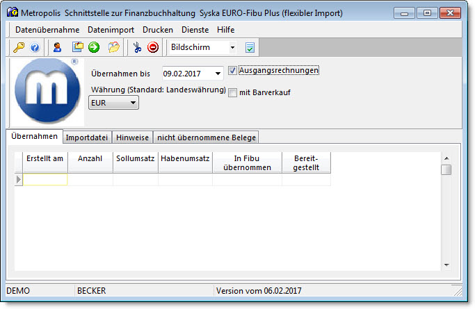 Nach Aufruf der metroFibu.exe und Anmeldung mit Mandant und Benutzer wird die Benutzeroberfläche angezeigt, die bei allen Fibu-Schnittstellen (metroFibu.exe) nahezu identisch aufgebaut.