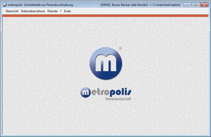 Nach Aufruf der metroFibuV3.exe und Anmeldung mit Mandant und Benutzer wird die Benutzeroberfläche angezeigt, die bei allen Fibu-Schnittstellen (metroFibuV3.exe) nahezu identisch aufgebaut. Danach wird automatisch das Formular Übersicht aufgerufen - siehe weiter unten im Text.