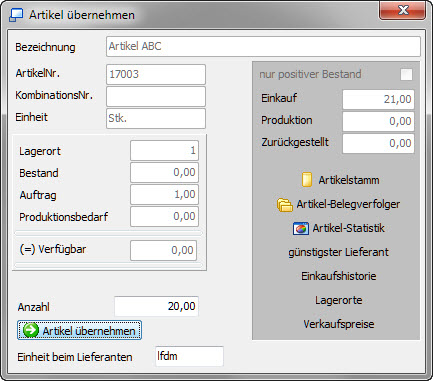 Im Feld Anzahl wird die zu übernehmende Menge eingetragen und auf den Button Artikel übernehmen geklickt.