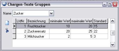 2. Rufen Sie das Menü Artikel/Cargen/Texte/Gruppen auf. Wählen Sie den Gruppennamen aus und geben Sie Bezeichnungen mit minimalen, maximalen und Standardwerten ein.