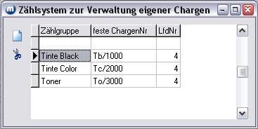 Die Zählgruppe wird einer Warengruppe oder einzelnen Artikeln zugeordnet. In dem Beispiel würden - bei automatischer Chargennummern-Vergabe - die Chargen eines Artikel, dem die Zählgruppe „Tinte Black“ zugewiesen wurde, „Tb/1004“, „Tb/1005“ usw. lauten.