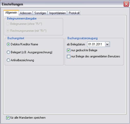 Unter den allgemeinen Einstellungen können Sie steuern wie die übergebene Belegnummer aussehen, ab welchem Datum und welche Belege übergeben werden sollen. Als Buchungstext stehen der
