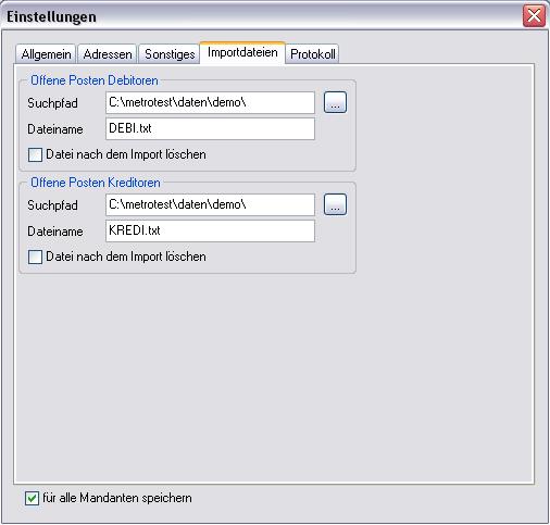 Sollen die Einstellungen für alle Mandanten gespeichert werden, aktivieren Sie das Kontrollkästchen für alle Mandanten speichern (Exportverzeichnisse müssen identisch sein). Ist das Kontrolkästchen nicht aktiviert, werden die Einstellungen nur für den aktuell aufgerufenen Mandanten gespeichert.