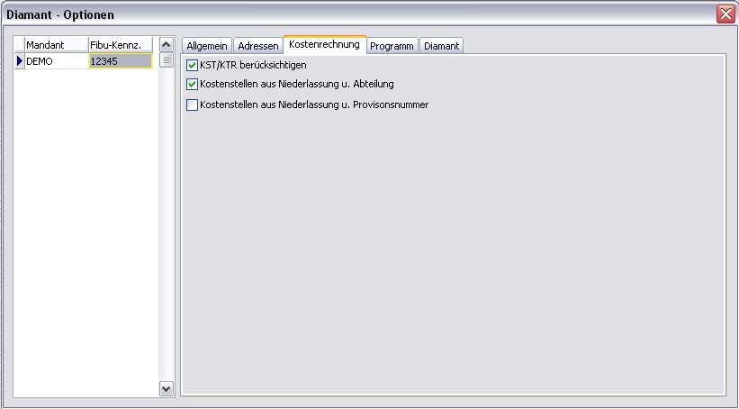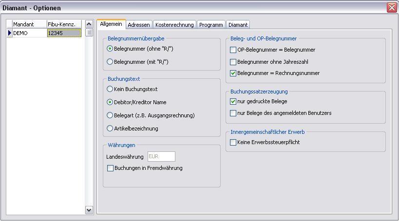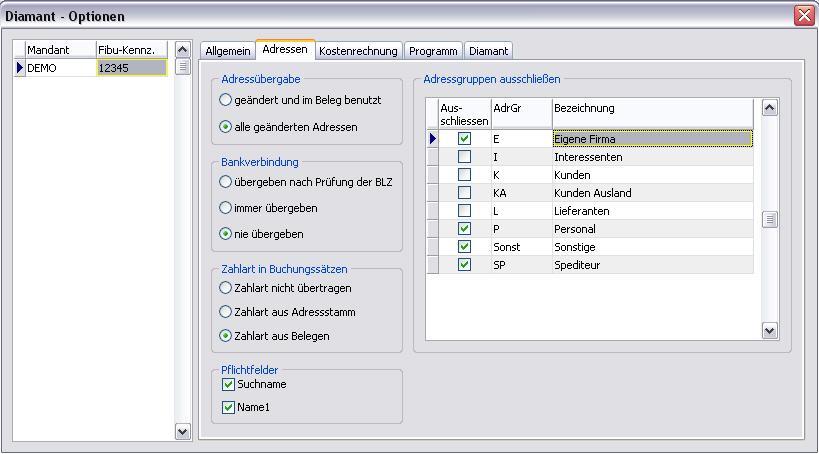 Im Register Diamant werden Pfade mit Dateinamen für Belege (Beispiel: C:\Diamant\Belege.txt) und Adressen (Beispiel: C:\Diamant\Adressen.txt) eingetragen. Weiterhin ist die Angabe der Diamant-Version und das Feldtrennzeichen anzugeben.