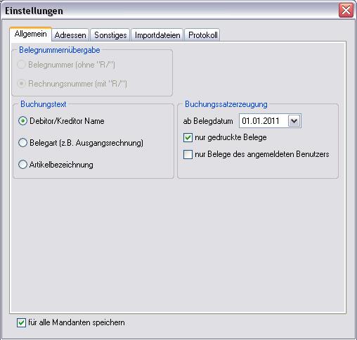 Unter den allgemeinen Einstellungen können Sie steuern wie die übergebene Belegnummer aussehen, ab welchem Datum und welche Belege übergeben werden sollen. Als Buchungstext stehen der