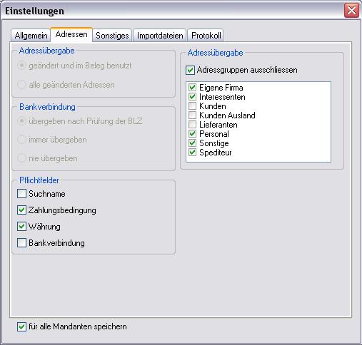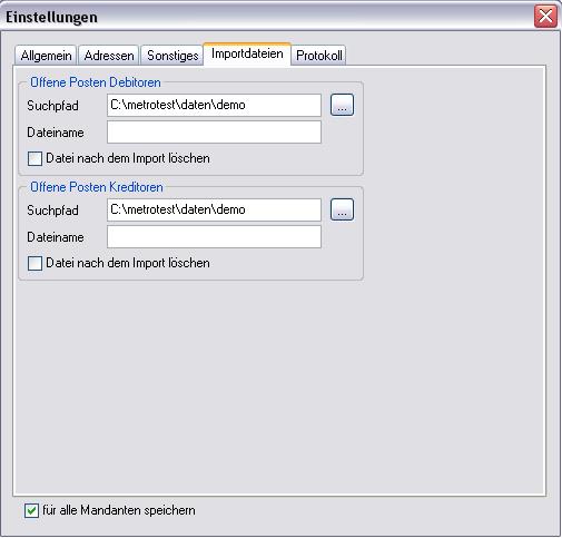 Sollen die Einstellungen für alle Mandanten gespeichert werden, aktivieren Sie das Kontrollkästchen für alle Mandanten speichern (Exportverzeichnisse müssen identisch sein). Ist das Kontrolkästchen nicht aktiviert, werden die Einstellungen nur für den aktuell aufgerufenen Mandanten gespeichert.