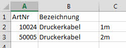 Beispiel einer erzeugten XLSX-Datei - (Ausschnitt) gemäß der SQL-Anweisung SELECT ArtNr, Bezeichnung FROM art