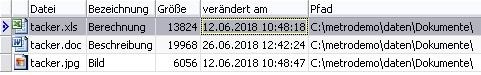 In diesem Beispiel wurden einem Artikel 3 verschiedene Dokumente zugeordnet. Welche Art von Dokumenten es ist bzw. mit welchem Programm diese erstellt bzw. aufgerufen werden, sehen Sie anhand der Symbole links neben dem Dateinamen.
