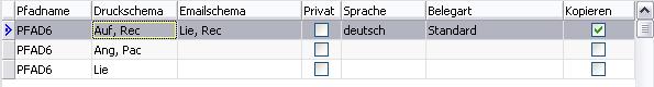 Im weiteren Verlauf der Tabelle können Daten eingetragen werden, die sich auf Belegdruck, Emailversand, usw. beziehen. Beispiel: