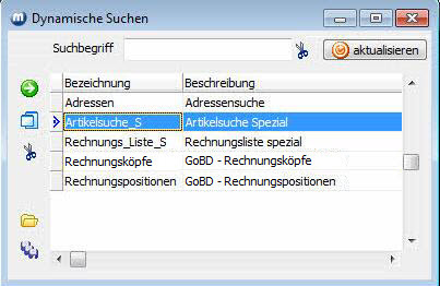 Rufen Sie die Dynamische Suche über das Menü Dienste/Dynamisches Suchen/Aufrufen auf und markieren Sie die Dynamische Suche, die exportiert werden soll (hier: Artikelsuche_S). Klicken Sie dann auf den Button