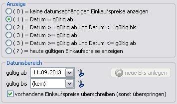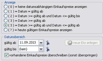 Bei dieser Einstellung wird nur das Datum 11.09.2013 mit dem Eintrag aus dem Feld gültig ab (im Artikelstamm) geprüft. Es werden also alle Einkaufspreise angezeigt, die das Datum 11.09.2013 im Feld gültig ab aufweisen und denen die Datumsart (1) im Artikelstamm zugewiesen ist.