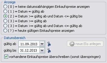 Bei dieser Einstellung wird das Datum 11.09.2013 mit dem Eintrag im Feld gültig ab (im Artikelstamm) und das Datum 31.12.2013 mit dem Eintrag im Feld gültig bis (im Artikelstamm) geprüft. Es werden also alle Einkaufspreise angezeigt, die in den Feldern gültig ab und gültig bis das jeweilige Datum aufweisen und denen die Datumsart (2) im Artikelstamm zugewiesen ist.