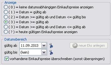 Bei dieser Einstellung wird nur das Datum 11.09.2013 mit dem Eintrag im Feld gültig ab (im Artikelstamm) geprüft. Es werden also alle Einkaufspreise, die ab dem gewählten Datum gültig sind und denen die Datumsart (3) im Artikelstamm zugewiesen ist, angezeigt.