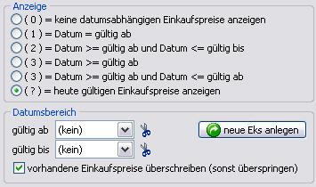 Geben Sie nur in das Datumsfeld gültig ab ein Datum ein und klicken auf den Button neue Eks anlegen, werden datumsabhängige Einkaufspreise [basierend auf den derzeit gültigen Einkaufspreisen (*)] mit der Datumsart (3) [gültig ab Datum] angelegt.