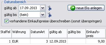 Klicken Sie jetzt auf den Button neue Eks anlegen, wobei das Kontrollkästchen vorhandene Einkaufspreise überscheiben (sonst überspringen) aktiviert ist, dann ändert sich der datumsabhängige Preis für den 17.09.2013 mit 10,00 Euro auf 9,00 Euro.