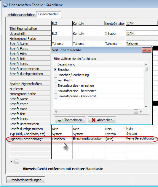 Das nächste Beispiel zeigt die Rechtevergabe für die Tabelle im Register Bank der Adress-Stammdaten - ohne vorherigen Designeraufruf.