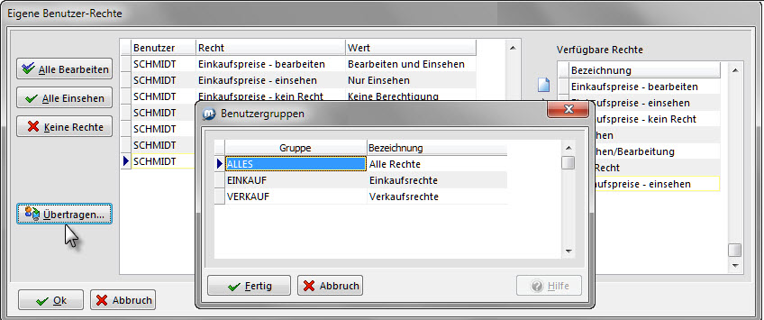 Rechte eines Benutzers können auf eine Benutzergruppe übertragen werden. Im Formular Benutzerverwaltung wird zuerst der Benutzer markiert, dann über den Button Eigene Rechte das Formular Eigene Benutzer-Rechte aufgerufen. Mit dem Klick auf den Button Übertragen öffnet sich das Formular Benutzergruppen. Hier wird die gewünschte Gruppe markiert und die Rechte über den Button Fertig auf die Gruppe und damit auch auf alle Mitglieder dieser Gruppe übertragen.