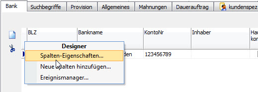 1. Rufen Sie das Register Bank in den Adress-Stammdaten auf. Mit Doppelklick auf der ersten Überschriftsspalte öffnen Sie das Kontextmenü Designer und wählen Spalten-Eigenschaften....