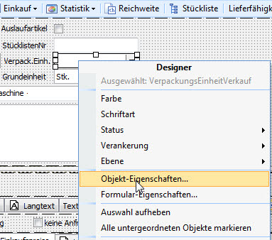 Rufen Sie danach den Designer auf und klicken Sie auf das Objekt. Klicken Sie mit der rechten Maustaste um das Designer-Menü Objekt-Eigenschaften aufzurufen.