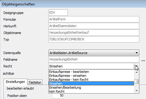In den Objekteigenschaften befindet sich das Listenfeld Recht. Hier suchen Sie aus den zur Verfügung stehenden Einträgen, das gewünschte Recht aus.