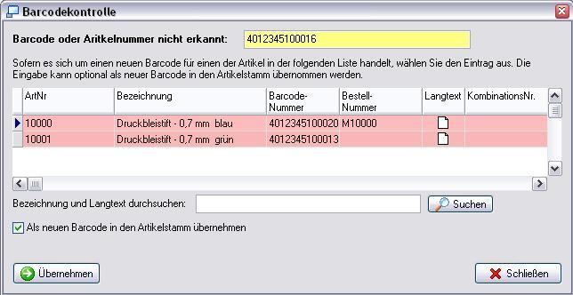 Barcode-Kontrolle: Ist das Kontrollkästchen aktiviert, wird die Barcodekontrolle automatisch beim Scannen einer Barcode-Nr. (bzw. bei einer Eingabe einer ArtikelNr.), die nicht im Einkaufsbeleg vorhanden ist, angezeigt. Im Formular Barcodekontrolle werden alle Artikel des Einkaufsbeleges aufgelistet. Sie haben dort die Möglichkeit, den vorhandenen Barcode eines Artikels durch den neuen Barcode ersetzen zu lassen (Kontrollkästchen Als neuen Barcode in den Artikelstamm übernehmen muss dazu aktiviert sein. Ist es inaktiv, wird der vorhandene Barcode beibehalten). [Ist eine - in dem Einkaufsbeleg nicht vorhandene - Artikelnummer eingegeben worden, wird diese wie ein Barcode behandelt und ggf. in das Feld Barcode der Artikelstammdaten geschrieben, es findet also keine Überschreibung der Artikelnummer statt!]