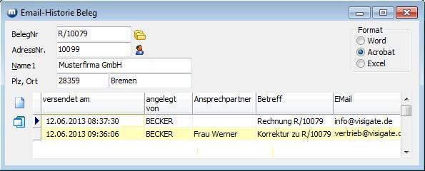 Über das Belegkontextmenü Dienste/Email/Historie können Sie sich die bereits für den Email-Versand erzeugten Beleg anzeigen lassen. Beispiel: