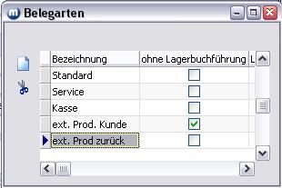 Der Belegart "ext.Prod. Kunde" (anzulegen im Menü Dienste/System/Belege/Belegarten) muss Lagerbuchführung haben, d.h. das Kontrollkästchen in der Spalte ohne Lagerbuchführung bleibt leer. In der Konfiguration, Register Produktion, Listenfeld Belegart von Aufträgen für die Produktion (Lieferung der Artikel an den Kunden) ... wird diese Belegart zugewiesen