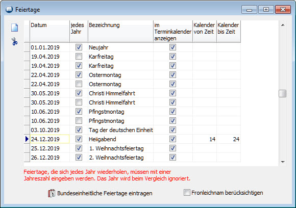 Wenn die Feiertage im Terminkalender gekennzeichet werden sollen, muss je eingetragenem Feiertag die Spalte im Terminkalender anzeigen aktiviert werden. Zusätzlich dazu können Sie bestimmen, welche Zeit für den Feiertag gekennzeichnet werden soll. Trotz des Feiertages können jedoch Termine eingeplant werden.