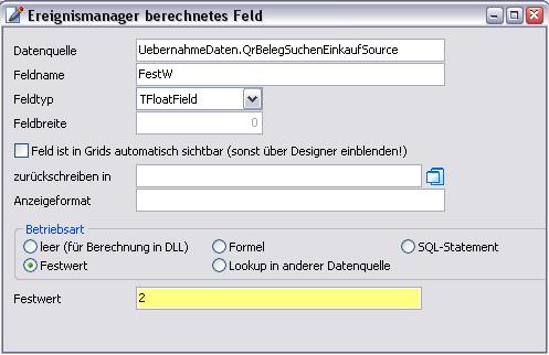 Sie klicken im Register OnCalcFields/Lookup auf den Button Feld einfügen. und geben zuerst die Daten für den Festwert ein.