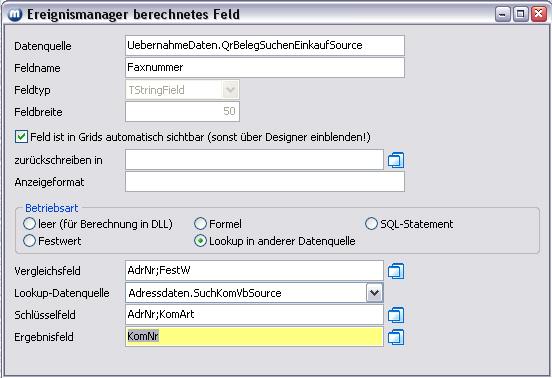 Vergleichsfeld, Lookup-Datenquelle, Schlüsselfeld, Ergebnisfeld: Als Vergleichsfeld muss ein Feld aus der Datenquelle gewählt werden, dass die gleichen Daten enthält, wie ein Feld aus der Lookup-Datenquelle. (Beispiel: In einer Datenquelle "A" wird die AdressNr. im Feld AdrNr verwaltet, in der Lookup-Datenquelle "B" wird die AdressNr. im Feld LiefAdrNr verwaltet - dementsprechend müsste also in das Vergleichsfeld: "AdrNr" eingetragen werden und im Schlüsselfeld: "LiefAdrNr".). Hier im Beispiel der Grafik sind allerdings bei Felder gleichlautend.