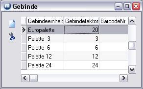 Gebindeeinheiten werden über das Menü Artikel/Parameter/Gebindeeinheiten neu eingegeben, geändert oder gelöscht. Legen Sie alle Ihre Gebindeeinheiten an. Der Gebindefaktor muss angegeben werden. Beispiel: Sie verpacken 0,7 Literflaschen in 6er Kisten. Auf einer Palette befinden sich 24 x 6er Kisten. Neben der Eintragung der Verpackungseinheit (z. B. 6er Kiste) und des Verpackungsfaktors (6) muss die Gebindeeinheit (z. B. Palette 24) und der Gebindefaktor (24) eingegeben werden.