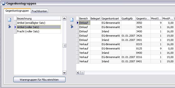 Wollen Sie die Gegenkontogruppen anders als Ihre Warengruppen benennen, geben Sie in der linken Tabelle die Gegenkontogruppen ein.