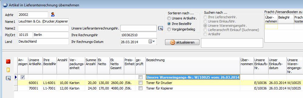 In der Lieferantenrechnung (in den Belegpositionen) wird in die Spalte Bezeichnung - oberhalb der Artikel - die Wareneingangs-Nr. und das Wareneingangsdatum eingetragen und die Daten für Ihre RechnungsNr. und Ihr Rechnungsdatum in den Belegkopf übernommen.