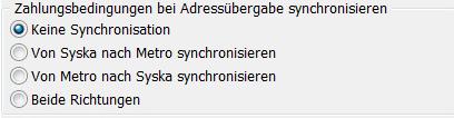 Beide Richtungen: Zahlungsbedingungen, die in Syska, aber nicht in metropolis vorhanden sind, werden im metropolis angelegt. Gleiches gilt für die umgekehrte Richtung.