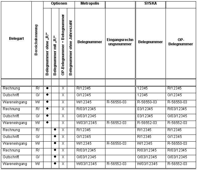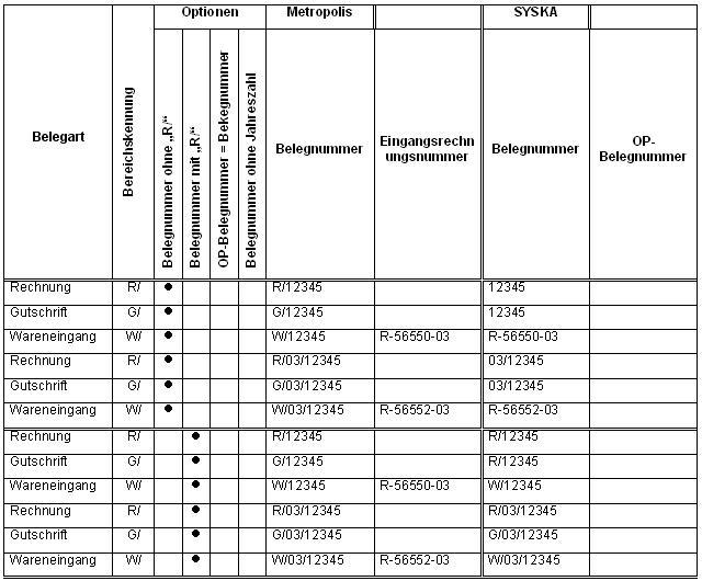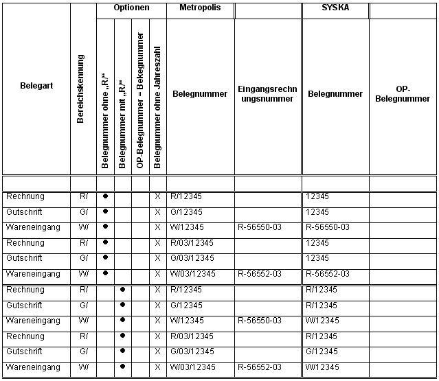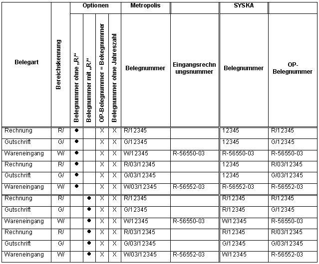 Im Register Belegnummern werden die Beleg- und die OP-Belegnummer, die an SYSKA übergeben werden sollen, definiert. Dieses macht vor allem Sinn, wenn im metropolis-Belegnummernzählkreis mit Jahreszahl und evtl. auch mit einer freien Kennung gearbeitet wird, denn für die Belegnummer sind nur 8 Zeichen reserviert. Nachfolgend eine Übersicht der Einstellungsmöglichkeiten und den dazugehörigen Ergebnissen.