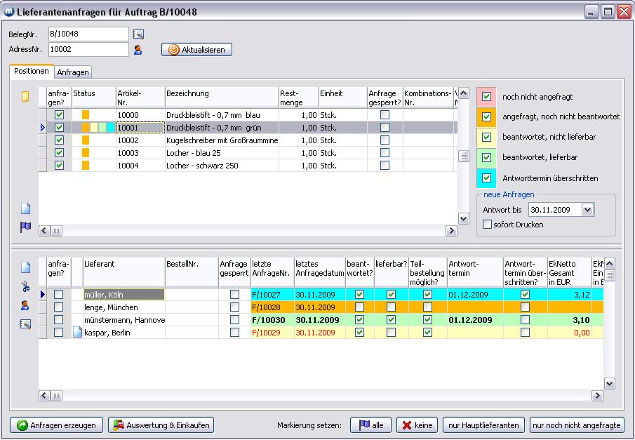 Über das Kontextmenü Allgemeines/Anfrage an mehrere Lieferanten können Sie für das aktuelle Angebot (den aktuellen Auftrag) Lieferantenanfragen erzeugen und sich Auswertungen ausgeben lassen. Für den Auftrag können außerdem direkt Einkäufe bei Lieferanten erzeugt werden.