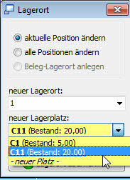 - Option aktuelle Position ändern: Wählen Sie einen Lagerort aus dem Listenfeld neuer Lagerort aus oder geben Sie hier direkt einen neuen Lagerort ein. Bei Belegen, in denen Lagerab-/Lagerzubuchungen stattfinden, funktioniert dies nur, wenn nicht mit positiven Beständen gearbeitet wird. Falls Sie mit Lagerplätzen arbeiten und für den Artikel Lagerplätze vorgesehen sind, wählen Sie einen der bestehenden Lagerplätze aus oder geben Sie einen neuen Lagerplatz direkt in das darunter liegende Feld ein.