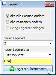 - Option alle Positionen ändern: Wählen Sie einen Lagerort aus dem Listenfeld neuer Lagerort aus oder geben Sie hier direkt einen neuen Lagerort ein. Klicken Sie auf den Button Lagerort übernehmen. Bei Belegen, in denen Lagerab-/Lagerzubuchungen stattfinden, funktioniert dies nur, wenn nicht mit positiven Beständen gearbeitet wird. Der neue Lagerort wird im Belegkopf im Feld Lagerort angezeigt.