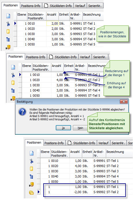 Kontextmenü Dienste/Positionen mit Stückliste abgleichen: Über das Kontextmenü können Sie einen Abgleich zwischen den Mengen der Produktionspositionen und den in der Stückliste gespeicherten Artikelpositionen vornehmen lassen.