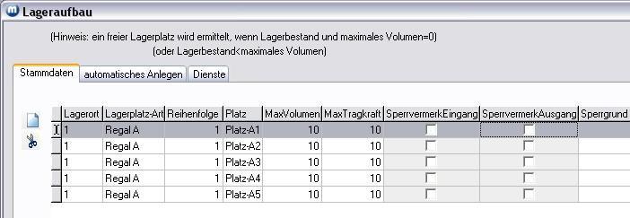 Nachdem das automatische Anlegen der Lagerplätze erfolgt ist, klicken Sie auf das Register Stammdaten. Hier haben Sie die Möglichkeit, Zeilen aus der Tabelle zu entfernen, weitere Zeilen aufzunehmen und Änderungen durchzuführen. Weiterhin können Sie Sperrvermerke setzen.