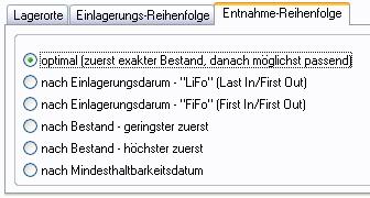 3. Bestimmen Sie die Voreinstellung der Lagerentnahme-Reihenfolge in der Warengruppe im Register Lager, Register Entnahme-Reihenfolge