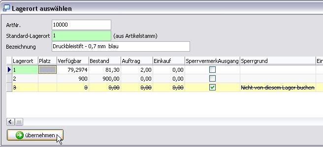 Ist in den Artikelstammdaten im Register Lager, Register Stammdaten das Kontrollkästchen Lagerortauswahl im Verkauf (bzw. Lagerortauswahl im Einkauf) aktiviert, wird vor der Artikelübernahme in einen Beleg das Formular Lagerort auswählen angezeigt. Hier kann ein Lagerort ausgewählt werden. Der Standard-Lagerort wird farbig hinterlegt angezeigt - sowohl im gleichnamigen Feld als auch in der Tabelle. Ein gesperrter Lagerort wird farbig hinterlegt und gestrichen dargestellt. Sperrvermerk und Sperrgrund sind in der Tabelle aufgeführt. Eine Übernahme aus einem gesperrten Lagerort ist nicht möglich.