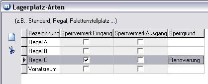 Zu jeder Lagerplatz-Art kann ein Sperrvermerk für Wareneingang und Warenausgang mit Grund der Sperrung eingegeben werden.