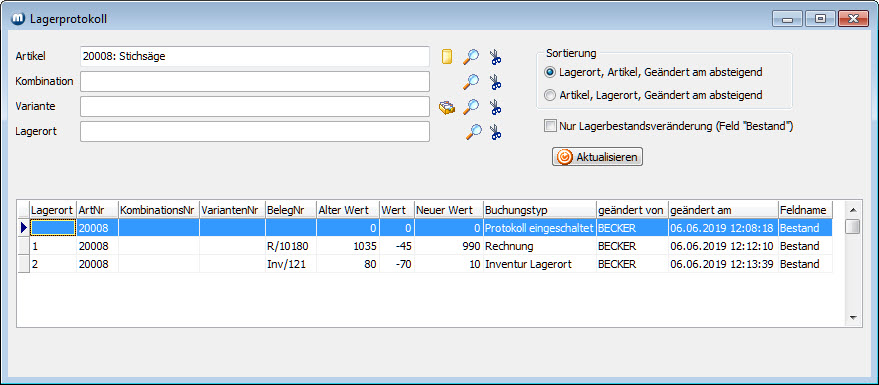 Über das Menü Lager/Lagerprotokoll können Sie für einen Artikel das Lagerprotokoll mit zusätzlichen Funktionen zum Eingrenzen der Anzeige aufrufen.