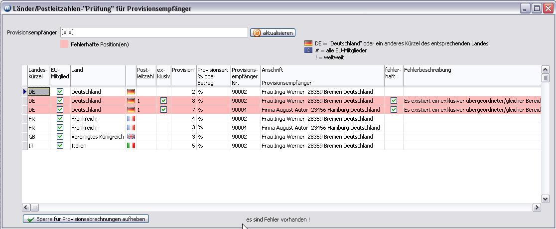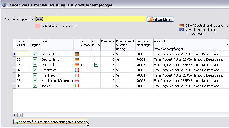 Für einen der Provisionsempfänger muss diese Einstellung im Register Länder/Postleitzahlen [G] korrigiert werden.