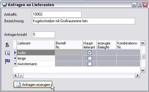 Geben Sie die Menge in das Feld Anfrage-Anzahl ein und markieren Sie die Lieferanten, bei denen angefragt werden soll. Klicken Sie dann auf den Button Anfragen erzeugen. Nachdem die Anfragen erzeugt wurden, werden die Anfragebelegnummern in der Spalte erzeugte BelegNr angezeigt. Die Belege können jetzt über das Symbol