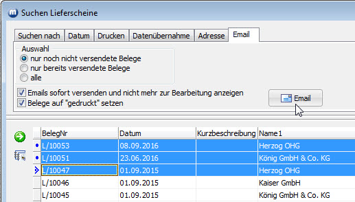 In der Lieferscheinsuche (Menü Verkauf/Lieferscheine/Suchen) kann ein direkter EMail-Versand von zuvor markierten Lieferscheinen durchgeführt werden. Dabei wird die E-Mail-Adresse des Ansprechpartners im Lieferschein verwendet. Ist kein Ansprechpartner zugeordnet, wird auf die Firmen-E-Mail-Adresse zugegriffen.